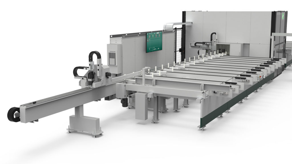 The machining unit LMX 650 tooled up with max 18 electrospindles and the cutting unit with infinite 360° blade rotation produce a continuous flow of processed and cut to measure elements. The additional machining module XMU carries out end milling (with blade, mill or mill units), boring and head tapping, as well as 45° and 135° inclined cuts, guaranteeing maximum flexibility for numerous applications. The high visibility cabin and the presence of the luminous FOM logo indicating the machine status are characteristic of the futuristic design of the system of LMX 650.